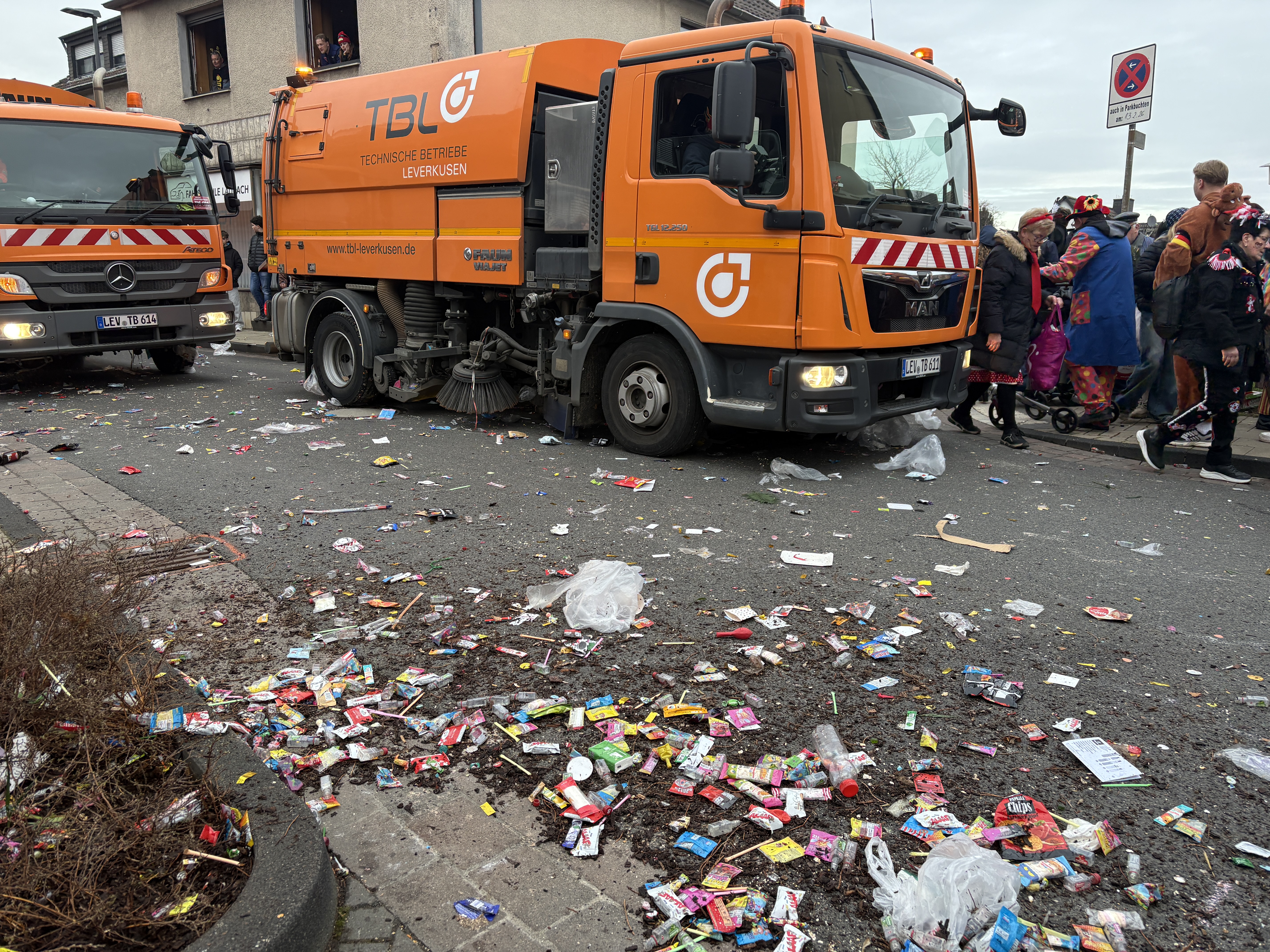 Unmittelbar nach den Zügen machten sich die TBL an die Straßenreinigung. Zurückgelassene Abfälle wie Kamelle, Verpackungen sowie leere Dosen und Flaschen wurden entlang der Zugstrecken eingesammelt und ordnungsgemäß entsorgt. Dafür nutzten die TBL unter anderem Kehrmaschinen, Kleinkehrmaschinen für Gehwege, Laubbläser, Besen und ein Müllfahrzeug. Bereits wenige Stunden nach dem Ende der Karnevalszüge waren die betroffenen Straßen wieder sauber.