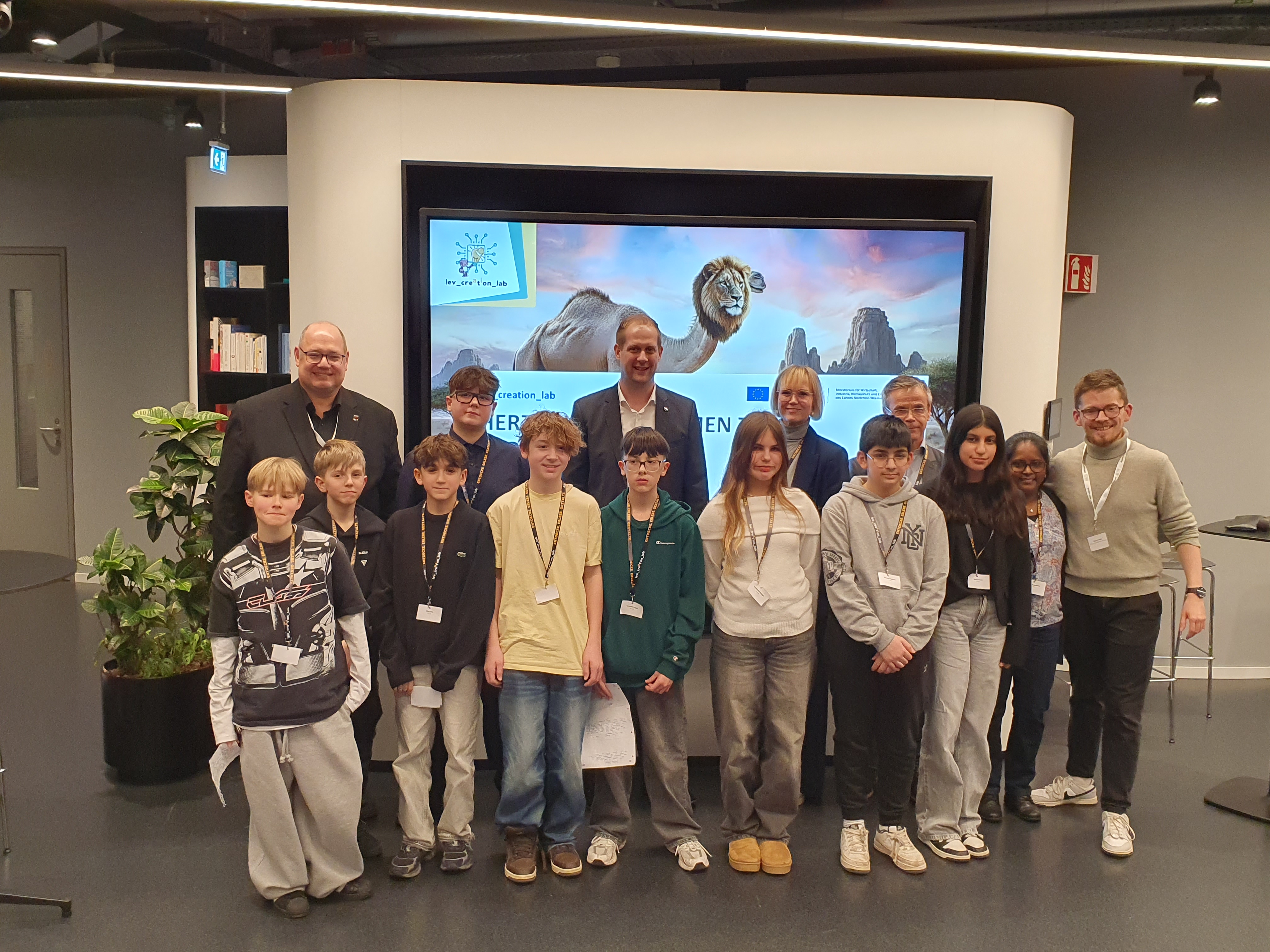 „Diese Angebote wären jedoch nicht möglich ohne die Unterstützung von Referent*innen aus der Wirtschaft, die regelmäßig in die AG kommen und jeweils eine Stunde zu einem konkreten Thema mit den Jugendlichen durchführen“, so Schwanke. Projektpartner Covestro unterstützte die AG beispielsweise durch Referent*innen, die eine Einheit zum Einsatz von KI bei Covestro leiteten und mit den Jugendlichen einen eigenen KI‑Chatbot programmierten. „Künstliche Intelligenz prägt bereits heute unsere Arbeitswelt und viele weitere Lebensbereiche – und die Technologie ist gekommen, um zu bleiben.“ so Florian Frankenau von Covestro. „Deshalb ist es entscheidend, dass junge Menschen möglichst früh verstehen, wie KI funktioniert und wie sie diese bestmöglich für sich nutzen können. Als innovatives Unternehmen sehen wir es als unsere Verantwortung, Jugendliche dabei zu unterstützen, diese digitale Realität zu verstehen und zu gestalten“ – Wissen, das durch Covestro und weitere Referent*innen aus unterschiedlichsten Unternehmen in die AG eingebracht und in praktischen Übungen umgesetzt wurde – alles ehrenamtlich. Auch Leverkusens Oberbürgermeister zeigte sich begeistert über die von den Jugendlichen gestalteten KI-Projekte: „Das <<lev-creation-lab>> zeigt, welche Potentiale der Einsatz von KI nicht nur für junge Menschen in der Arbeits- und Lebenswelt hat und wie schnell sie damit eigene Projekte verwirklichen. Deshalb wollen wir die Chance nutzen, KI im Schulterschluss mit der Wirtschaft weiter zu etablieren und noch mehr Jugendliche verantwortungsvoll an das Thema heranzuführen.“