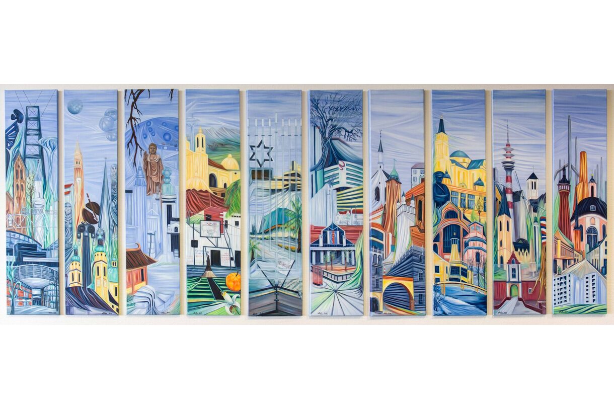Neun Partnerstädte und ein Bild von Leverkusen selbst bilden die Gemälde-Serie der Künstlerin Ellen Loh-Bachmann, ELOBA. Entstanden sind die Bilder der Leverkusener Malerin 2014/15.
