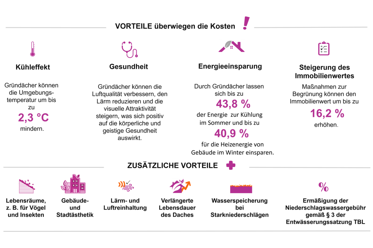 Gründächer haben zahlreiche ökologische Vorteile in Bezug auf Temperatur, Biodiversität, öffentliche Gesundheit, Energieverbrauch und Regenwasserversickerung. Aber auch für Ihr Gebäude gibt es eine Reihe von Vorteilen, nicht nur ästhetischer, sondern auch wirtschaftlicher Art, da die Lebensdauer Ihres Daches um das doppelte und der Wert Ihres Gebäudes generell steigen. Zusätzlich werden Ihre Niederschlagswassergebühren aufgrund der Regenwasseraufnahmekapazität des Gründachs sinken. Für dieses letztgenannte Thema wenden Sie sich bitte an die TBL, um Informationen (Öffnet in einem neuen Tab) und weiterführendes Material (Öffnet in einem neuen Tab) zu erhalten.