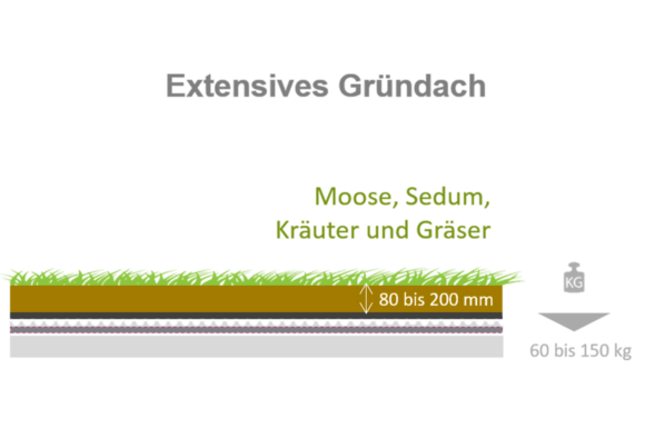 Es gibt verschiedene Arten von Gründächern, jede Art bietet unterschiedliche Vorteile und ist mit unterschiedlichen Kosten für Installation und Wartung verbunden. Je nach Dicke der Bodenschicht und den gewählten Pflanzen unterscheidet man zwischen extensivem (wenig Bodenschicht mit bodendeckenden Pflanzen), semi-intensivem (mittlere Bodenschicht mit kleinen Sträuchern) und intensivem Gründach (viel Bodenschicht mit Bäumen).