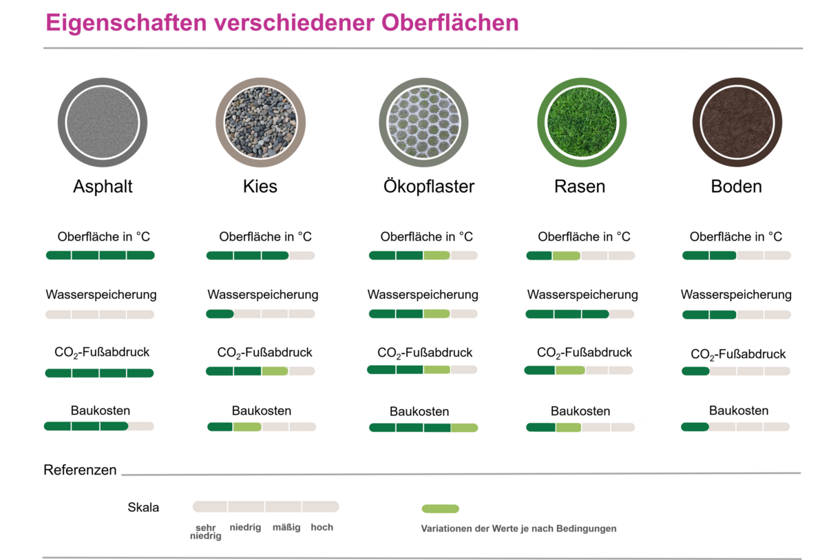 Wir empfehlen Ihnen, im Optimalfall 75 % der Grundstücksfreifläche als offene, unversiegelte und idealerweise begrünte Fläche, z. B. als Rasen, zu belassen. Verzichten Sie dabei auf die Anlage von Schotter- und Kiesgärten oder ausgedehnten versiegelten Flächen, da diese nicht nur tagsüber, sondern auch nachts Wärme speichern und abgeben und so ein hohe Temperaturen fördern. Rasenflächen haben im Vergleich dazu den gegenteiligen Effekt. So beträgt die nächtliche Temperatur von Asphalt während einer Hitzeperiode im Durchschnitt 29 °C und die des Rasens 22 °C.
