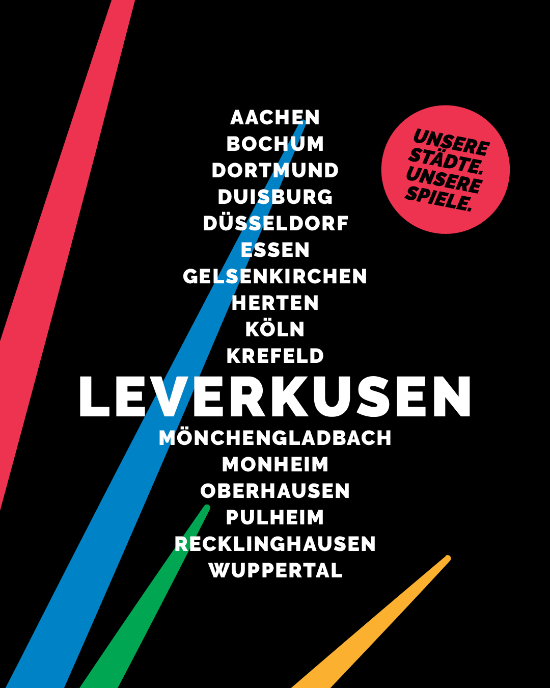 Das Konzept der Region KölnRheinRuhr bündelt die Stärken von 17 Kommunen in Nordrhein-Westfalen: Neben Leverkusen sind dies Aachen, Bochum, Dortmund, Duisburg, Düsseldorf, Essen, Gelsenkirchen, Herten, Krefeld, Mönchengladbach, Monheim am Rhein, Oberhausen, Pulheim, Recklinghausen und Wuppertal. Diese werden für die Wettbewerbe im Segeln um die Stärken von Kiel oder Warnemünde und für Kanu-Slalom von Markkleeberg ergänzt. „Leading City“ der Bewerbung ist die Stadt Köln.